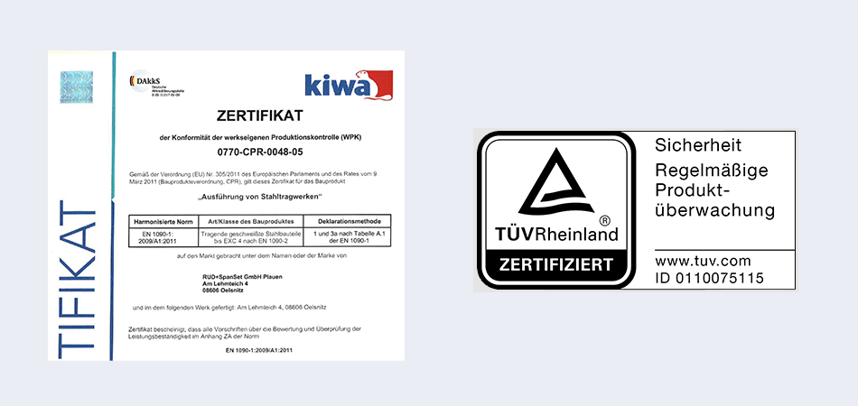 Das Schweißzertifikat bis EXC 4 nach DIN EN 1090-2:2008+A1:2011 erlaubt es RUD+SpanSet Plauen auch anspruchsvolle Schweißarbeiten nach geprüften Qualitätsstandards durchzuführen. Die fast 30-jährige Erfahrung in diesem Bereich zahlt sich aus.