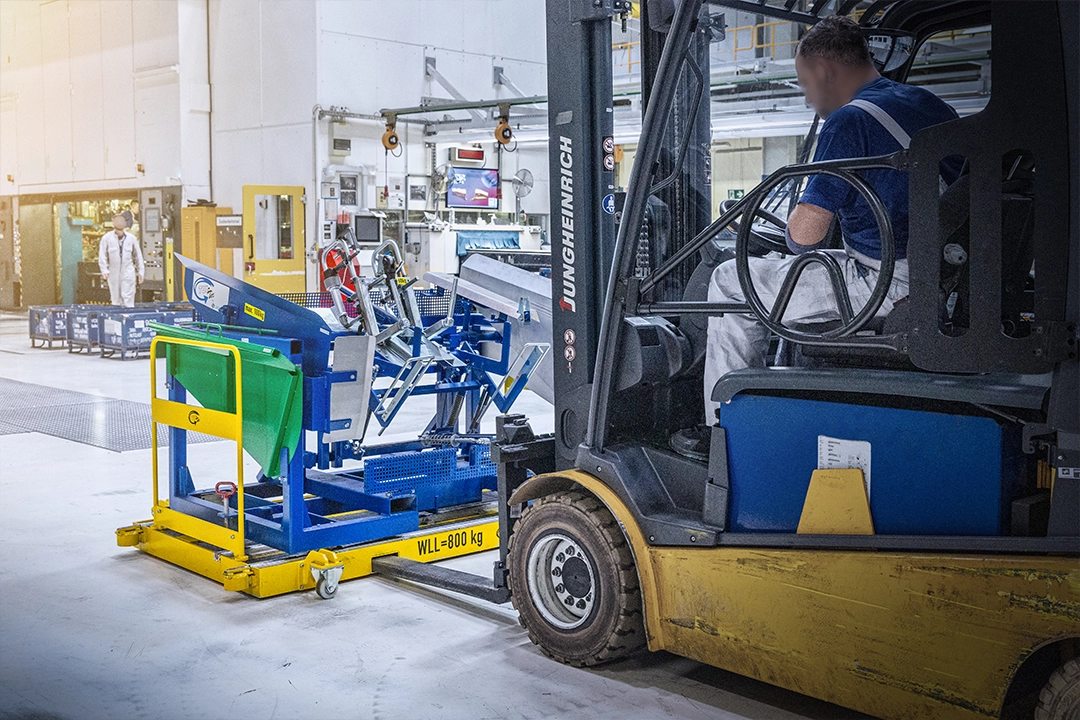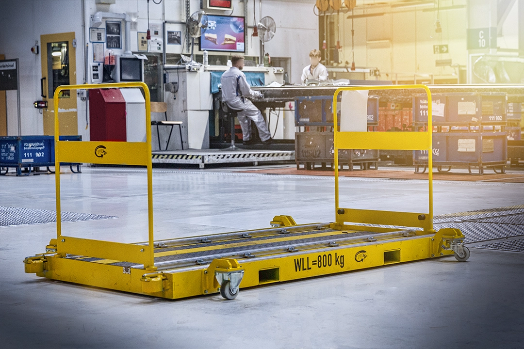 Transportwagen, der mittels Rollen sowie Stapelaufnahmen ausgestattet ist, ermöglicht das Transportieren der Aufnahmegestelle im Werk.