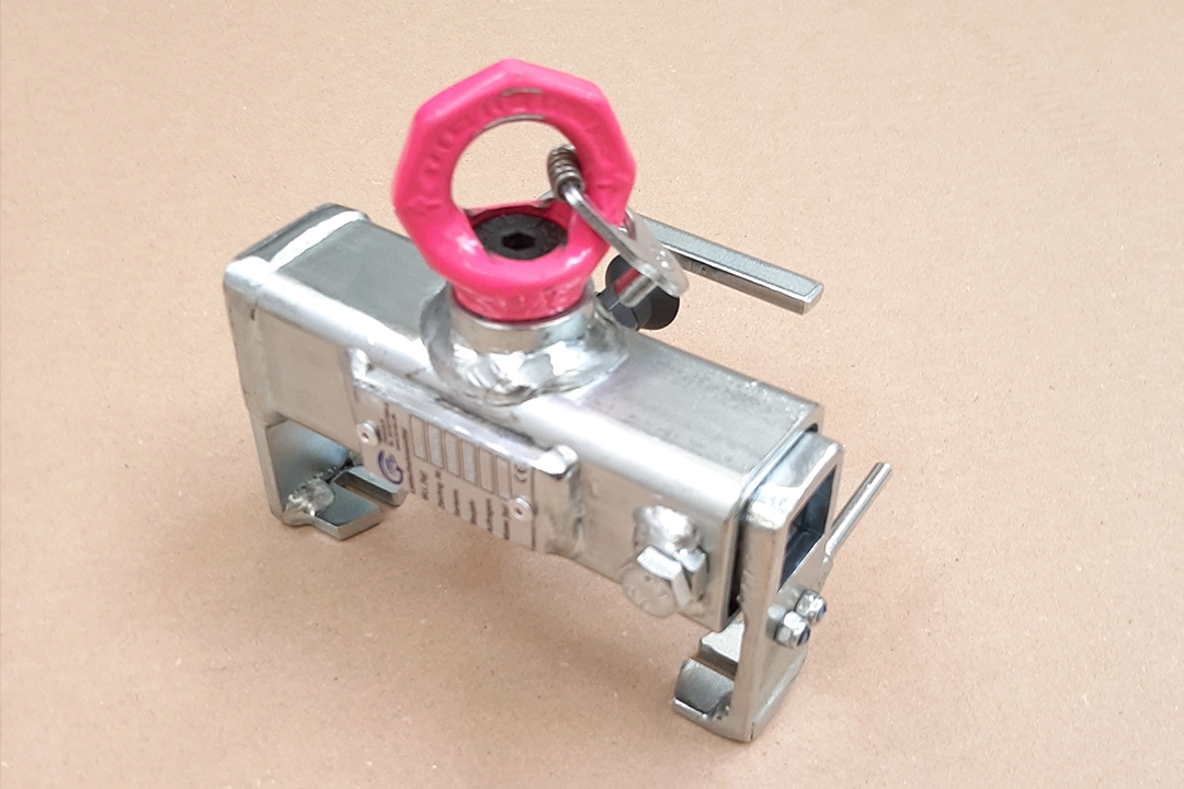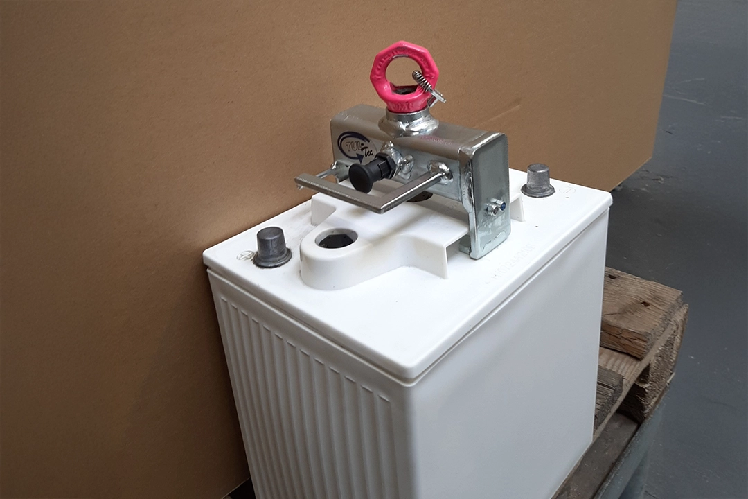 Durch einen Federmechanismus greift der Außengreifer in die Batteriekontur ein. Die RUD VRS-F Ringschraube ermöglicht eine 360° Drehung der Last für ein sicheres platzieren.