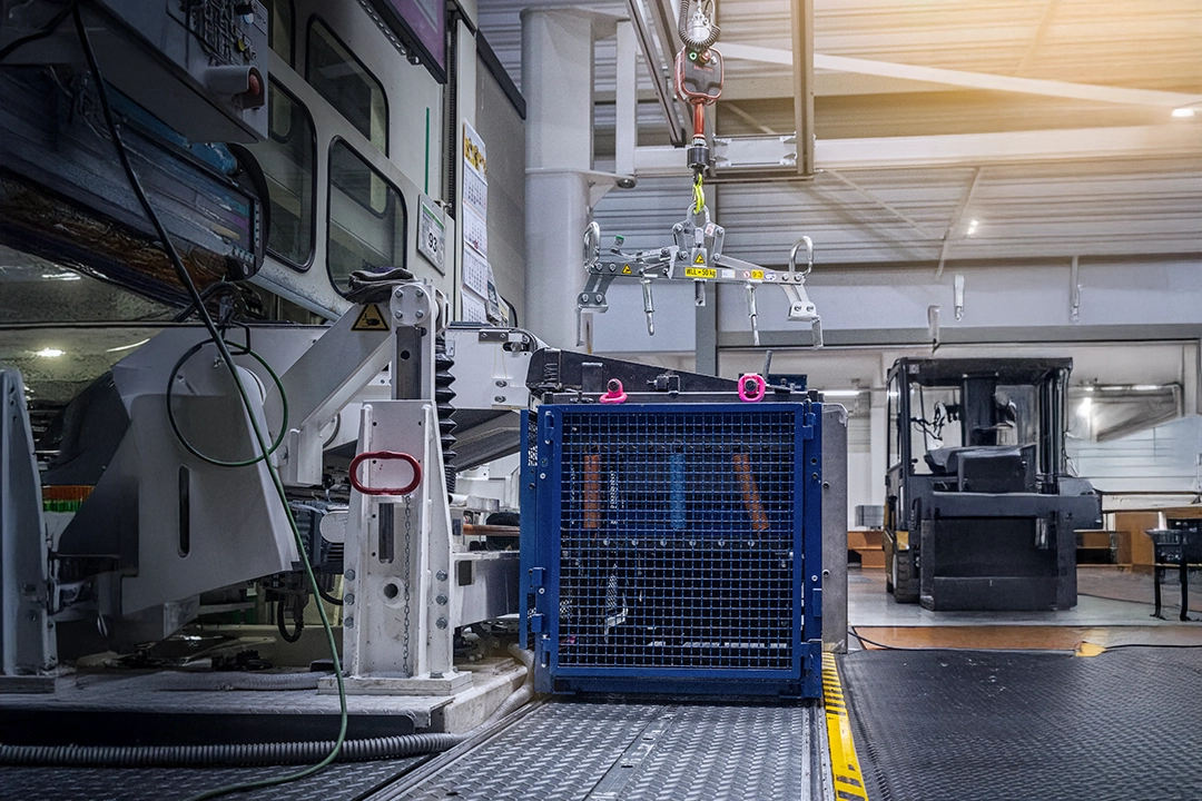 Fertig gepresste Karossenbauteile fallen aus der Bearbeitungsmaschine in eine verfahrbare Kiste und werden ggf. beschädigt.