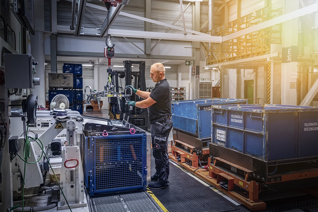Der auf Federn gelagerte Kistenboden sorgt für eine geringe Fallhöhe der Bauteile. Diese Bauteile können anschließend mithilfe des Greifers transportiert werden.