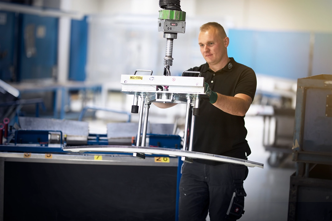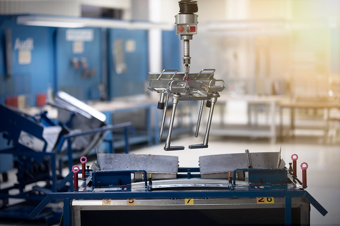 Speziell für die Last konstruierter Greifer ermöglicht das sichere und schnelle Heben durch manuell schwenkbare Aufnahmen. Zwei Führungsbolzen verhindern das Abrutschen der Last.