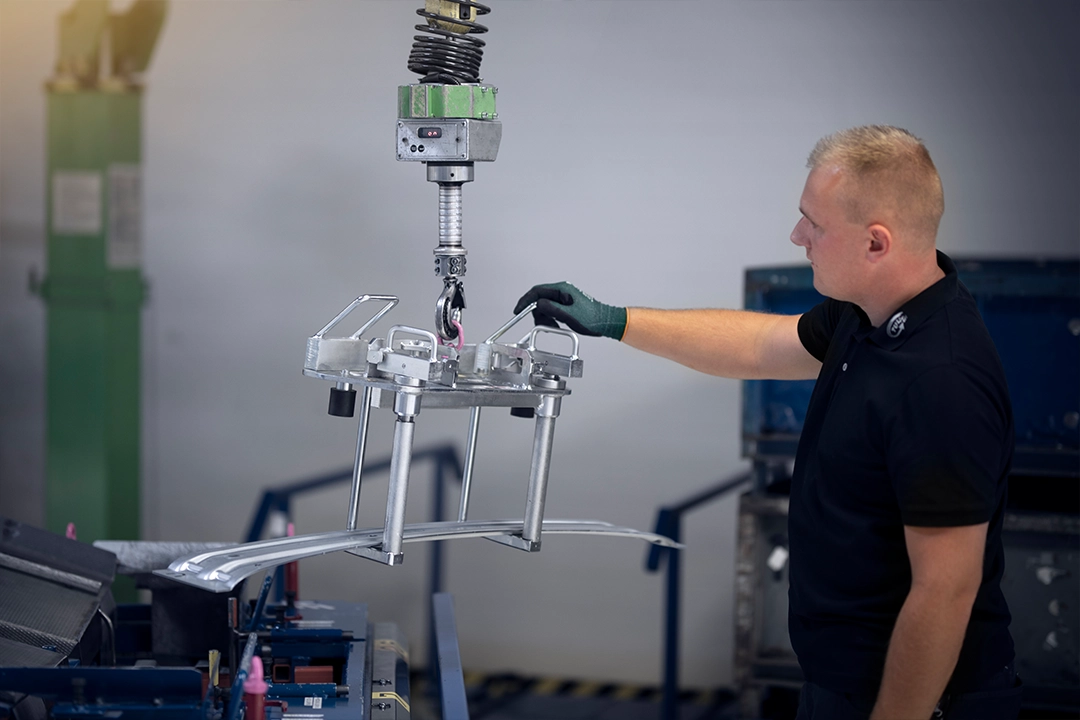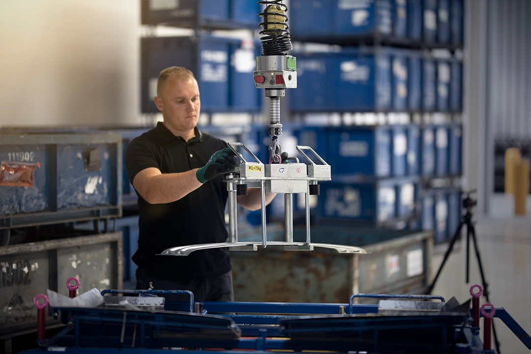 Ein speziell für die Last konstruierter Greifer ermöglicht das sichere und schnelle Heben durch manuell schwenkbare Aufnahmen. Zwei Führungsbolzen verhindern das Abrutschen der Last.