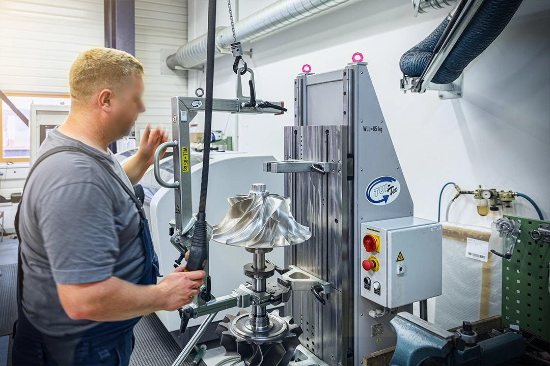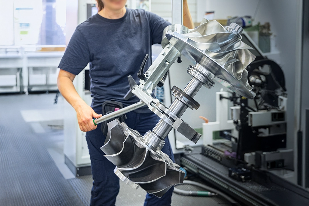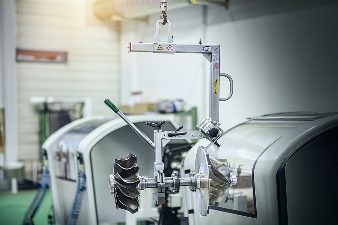 Transport von Turboladerwellen mit Schaufelrädern in eine Prüfmaschine.